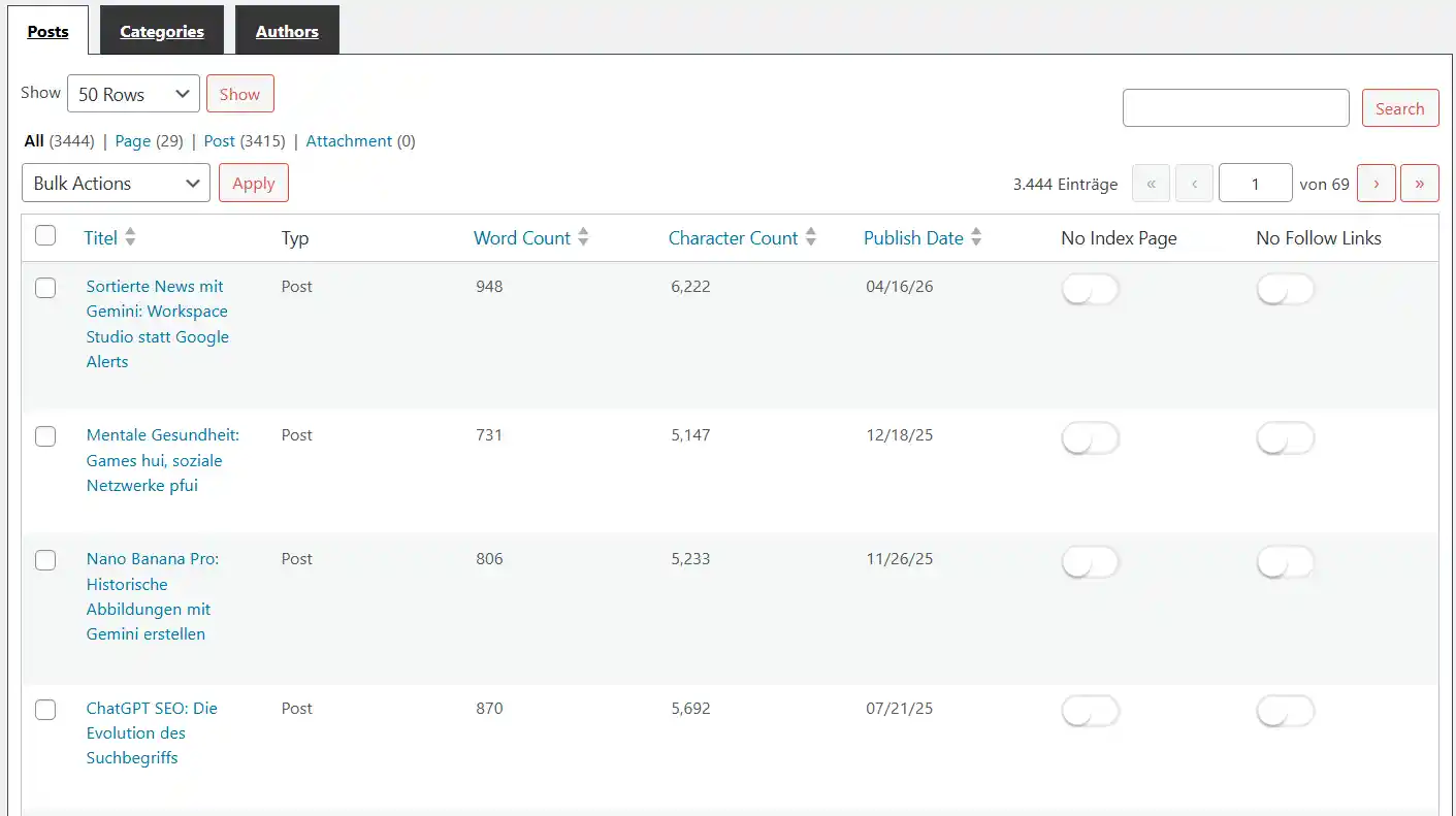 Andererseits sollte die Bereinigungsaktion auch nicht zu viel Arbeit in Anspruch nehmen und hier gab es schon ein erstes kleines Problem. Die gängigen großen SEO-Plugins erlauben zwar, einzelne Artikel oder bestimmte Bereiche (Kategorien, Schlagwörter etc.) für Suchmaschinen auszublenden. Was ich aber benötigte, war eine schnelle Übersicht über die Blogartikel und die Möglichkeit, einzelne oder mehrere Artikel direkt in der Übersicht auf noindexzu setzen.